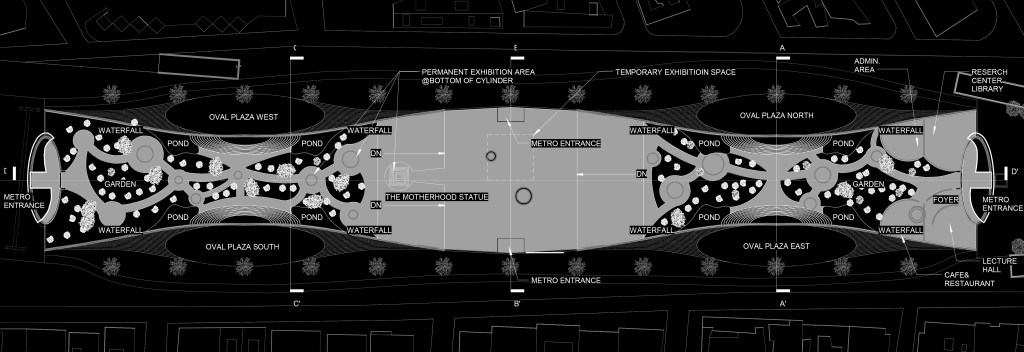 The top glass roof in the center of the structure functions as a funnel to collect rain water to be stored in the underground level tank and the layer below funnel glass will act as the solar panels to afford the building to function as the self-powered off-grid structure.