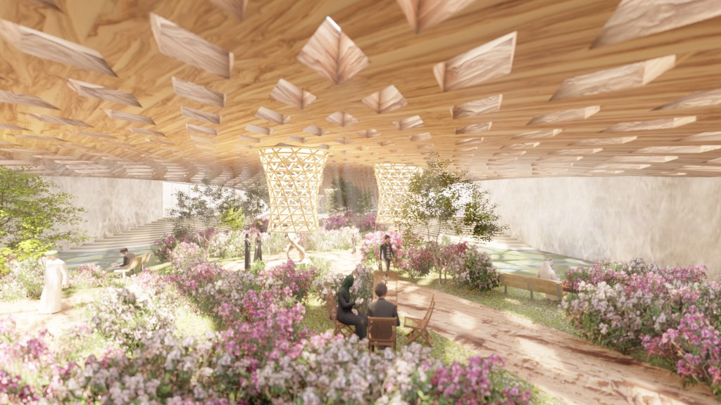 Inside space is filled with gardens with full of plants, ponds and water falls so that the visitors can feel walking around the nature.